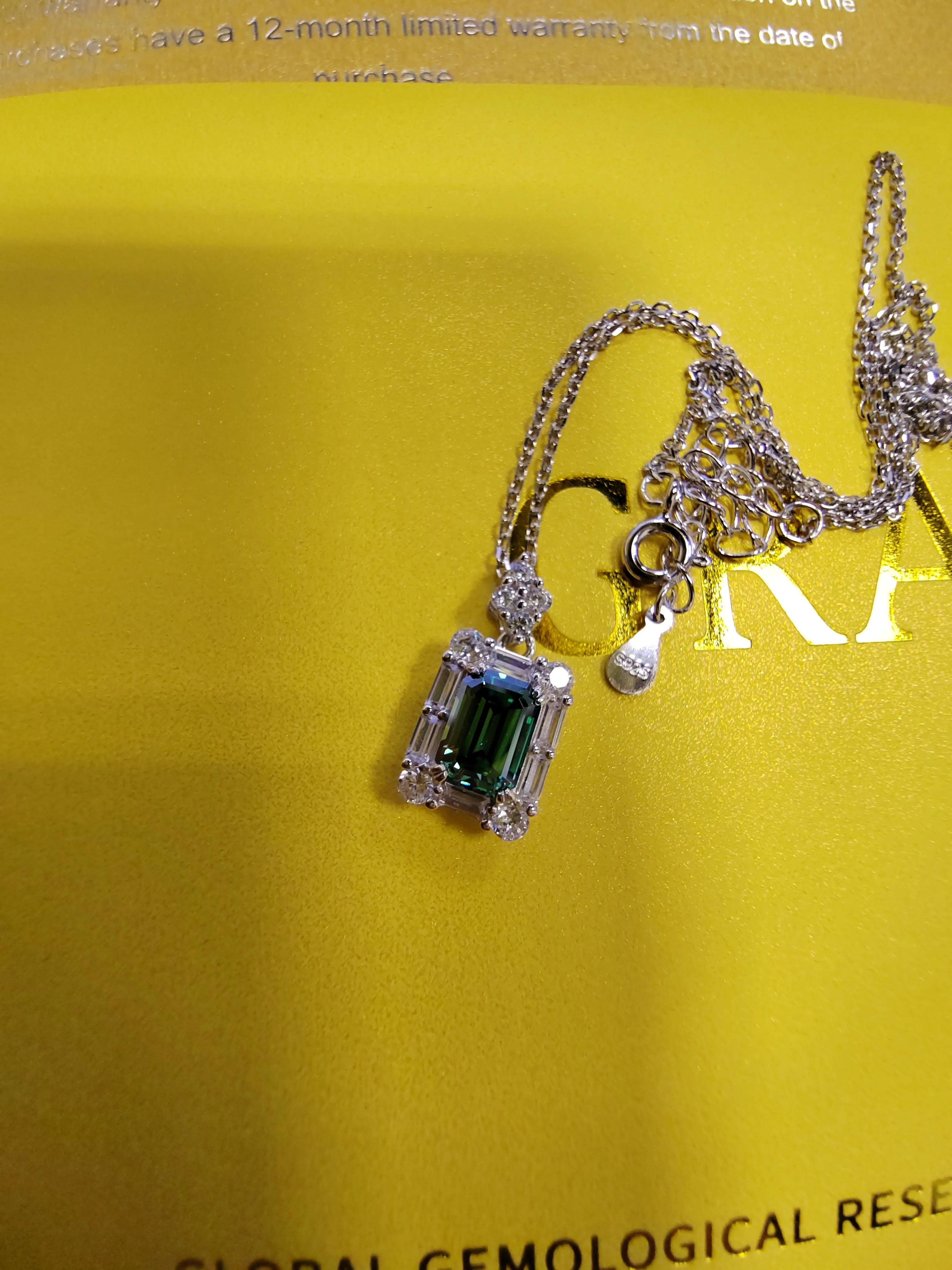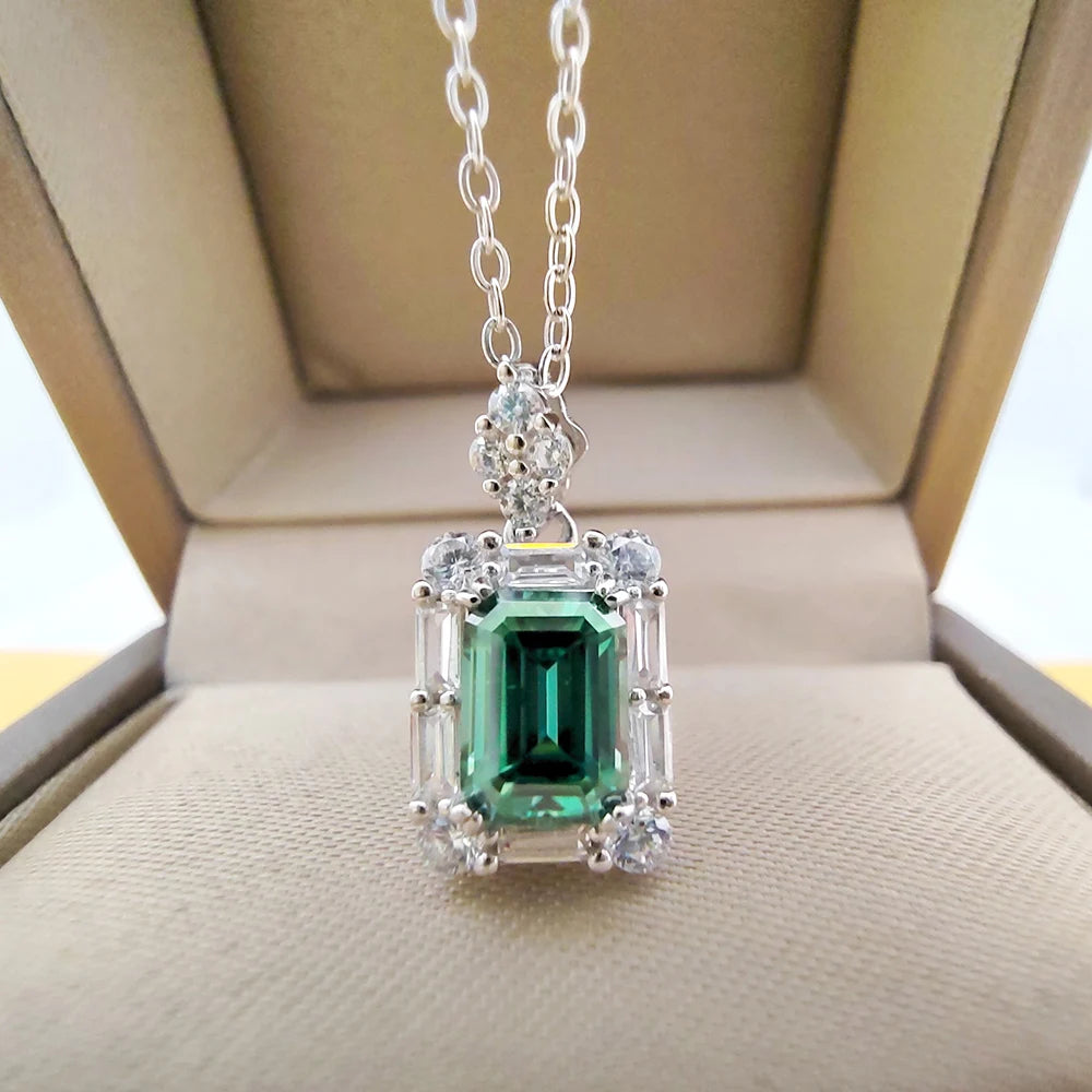 This green moissanite pendant necklace is absolutely stunning! The green emerald-cut moissanite is lovely and beautifully catches the light, giving it the brilliance of a diamond but with its own unique flair. The shade of green is slightly paler, but i actually like that it's subdued. It's easy to pair with pretty much anything. The chain and clasp feel sturdy and well-made. This is a beautiful and quality piece. Recommended!