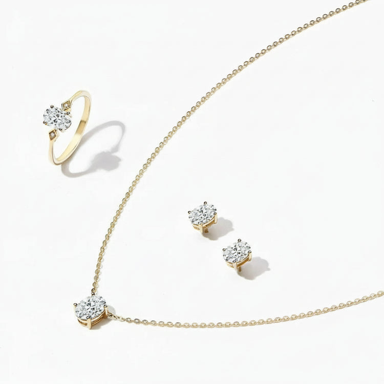 The centerpiece stones are D-Color VVS1 Moissanite Diamonds, carefully cut to maximize brilliance and fire. The necklace features an 8x6mm oval moissanite, while the ring and earrings showcase perfectly matched 7x5mm stones, creating a harmonious, elegant look. Each piece is designed for engagements, weddings, anniversaries, parties, and festive celebrations, ensuring a statement of luxury and style.