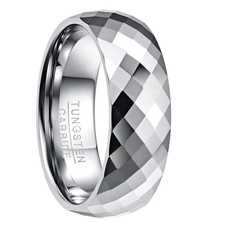 Crafted from durable tungsten with platinum plating, this 7.5mm ring features a multi-faceted rhombus pattern, creating a striking, dimensional look. Its tension setting and polished finish ensure both style and comfort, making it ideal as a wedding band, promise ring, or fashion statement.